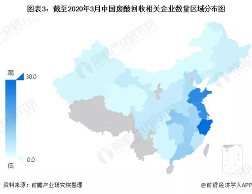 通過(guò)企查貓網(wǎng)站對(duì)廢酸回收業(yè)務(wù)相關(guān)企業(yè)進(jìn)行篩選統(tǒng)計(jì)分析,截至2020年3月,中國(guó)廢酸回收相關(guān)企業(yè)數(shù)量為177家,其中,浙江、山東、江蘇三省廢酸回收企業(yè)數(shù)量排名前三,分別為30家,24家和23家。