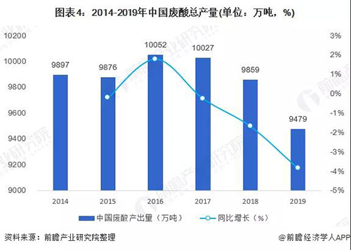 В 2019 году общий объем производства отработанной кислоты в Китае составил 94,79 млн тонн, что на 3,9% меньше, чем в предыдущем году. Отходы серной кислоты являются основным видом производства отработанной кислоты, в 2019 году объем производства отработанной серной кислоты составил около 90,2 млн. тонн, что составляет 95,2% от объема производства отработанной кислоты.