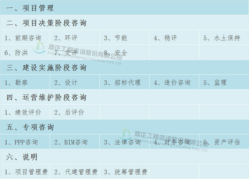 В соответствии со строительными характеристиками проекта и фактическими потребностями строительной организации, Вся консультативная организация может проводить модель консультационных услуг по всему процессу строительства проекта меню « 1 + N + X», в которой « 1» - это консультация по управлению проектом, необходимый вариант, который проходит через этап реализации проекта, « N» - это одно или несколько специализированных технических консультаций, таких как агентство по торгам, разведка, проектирование, надзор, ценовое консультирование и другие специальные инженерные консультации, и по крайней мере один из них является квалифицированным профессиональным и техническим консалтинговым бизнесом, который не реализуется самостоятельно, но должен координировать управление специальными услугами.